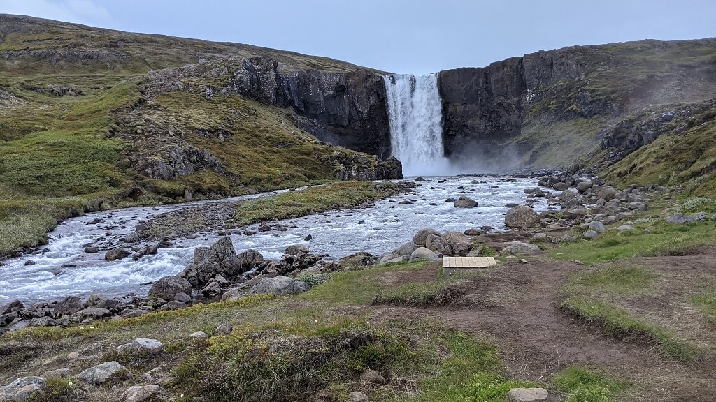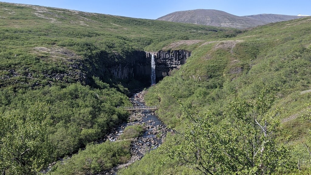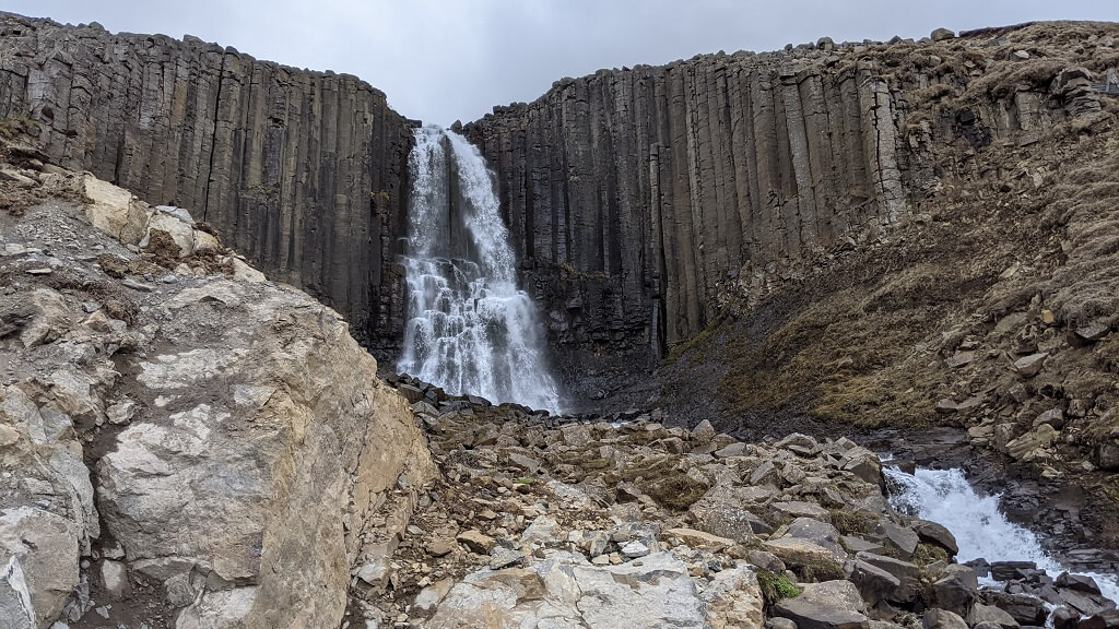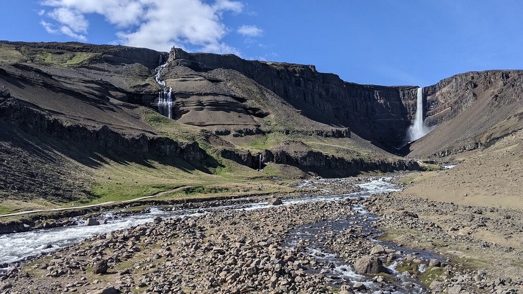 אחרי ארוחת הצהריים הביתית המשכנו בנסיעה לכיוון מפל Hengifoss. את ההמלצה על המפל קיבלנו במרכז התיירים בעיירה רק אחר כך ראיתי שגם בקבוצות הטיול מדברים עליו. הגענו לחניון הקטן שהיו בו כמה מכוניות וראינו שנשארנו עם מעט מאוד מי שתייה. מאחר והיה יום חמים למדי, ווידאנו עם כמה מטיילים שבדיוק חזרו שהמסלול לא ארוך מדי בשבילנו.