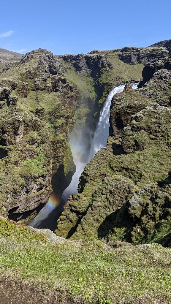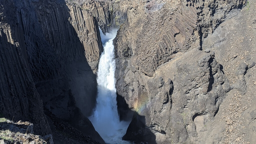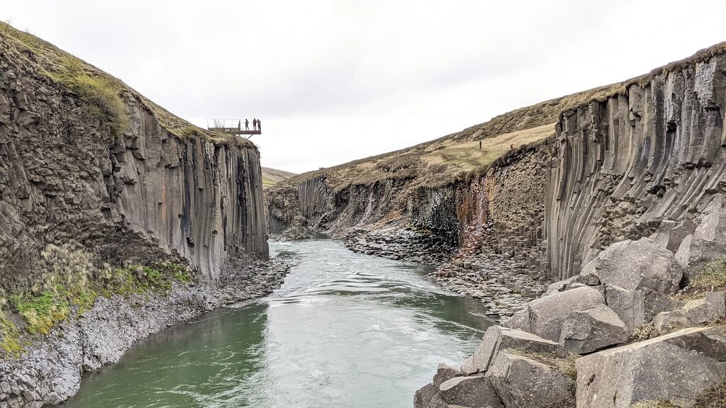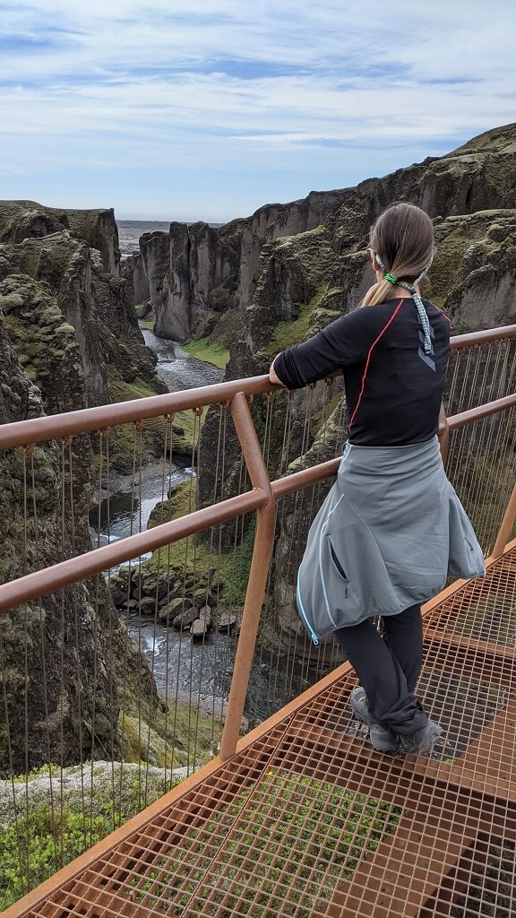 בצעדים איטיים חזרנו לאוטו. ליד החניון הקטן יש גשר וממנו יש תצפית נחמדה על כל הקניון. העומק והצבעים קצת פחות בולטים אבל זה עדיין מרשים לעמוד שם. בחניון הזדמן לנו לראות ממש מקרוב את אחד מאלפי הקמפרוואנים הקטנים שרבים מטיילים איתם. בקמפר כזה יש מיטה מתקפלת, כיור פיצפצון ופתרונות איחסון. זה ללא ספק מוזיל את עלות הטיול אבל צריך לזכור שאין בהם מקלחת ושירותים ולא ניתן לבשל בתוכם! מאחר ואפשר להגיד שאיסלנד היא מדינה שטופת רוח וגם קרה וגשומה, לטייל בה עם אוהל או קמפרוואן זה כייף בגלל השהות בטבע אך מאוד מאתגר (לדעתי).