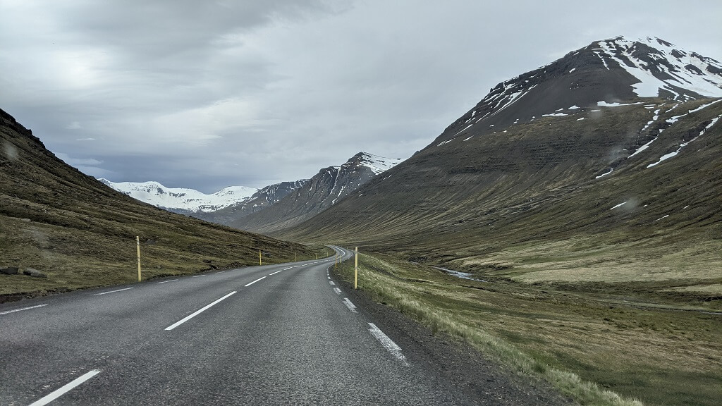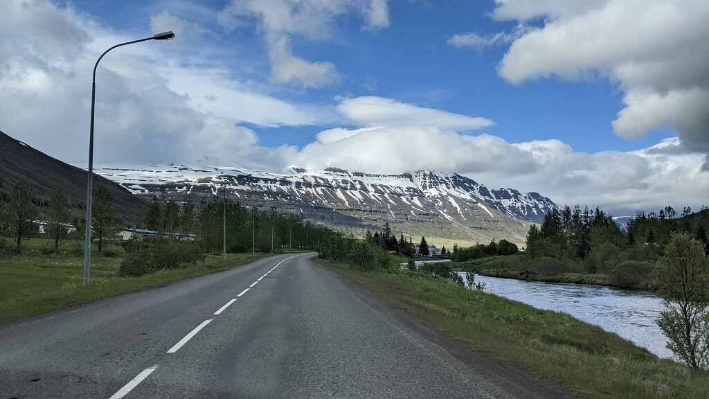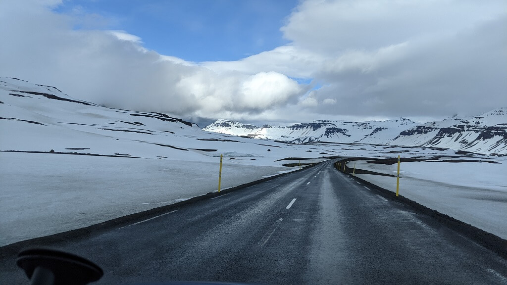 הדרך מהמלון לסיידיספיורדור התפתלה לה במעלה ההר, בדרך חלפנו על פני מפל Fardagafoss אבל החנייה שלו נראתה עמוסה אז החלטנו לא לעצור והמשכנו בדרך. ואז פתאום בלי שום אזהרה, מצאנו את עצמנו נוסעים בתוך שדה שלג אינסופי. מסתבר שהפס בדרך לעיירה עדיין לא הפשיר וזה היה פשוט מדהים! המראה של השלג מכל הכיוונים עם הכביש השחור והצר החוצה אותו, היה עוצמתי וסוריאליסטי ובשבילי (בלבד) אפילו קצת מלחיץ, ממש הרגשתי כאילו עוד רגע הכביש הצר נעלם ואנחנו נופלים לשלג – זה לא קרה…