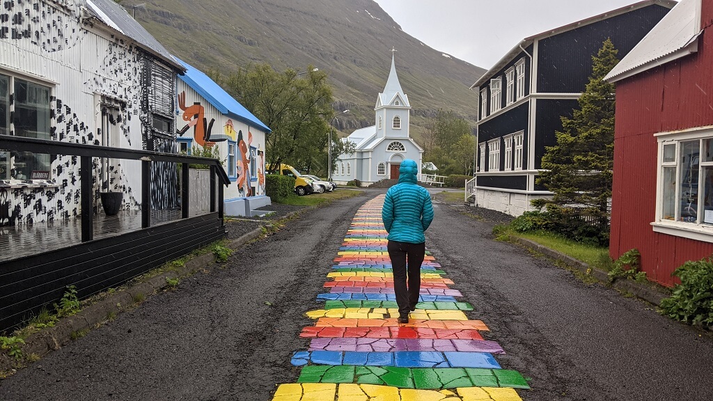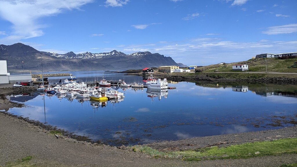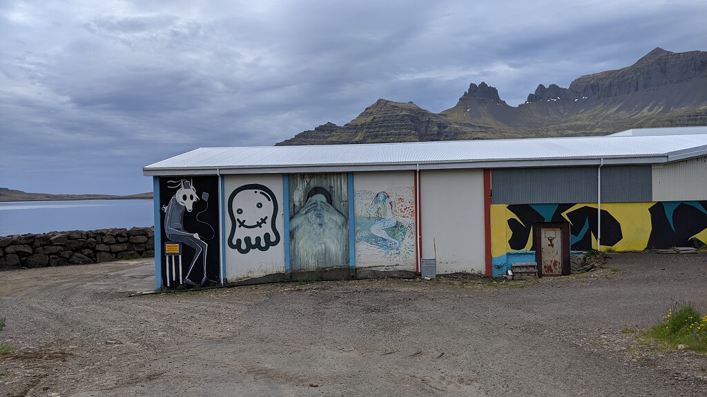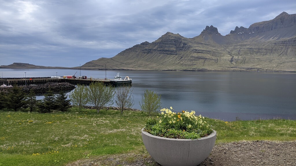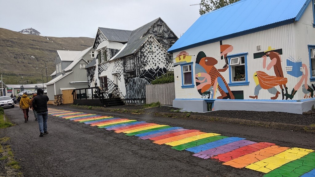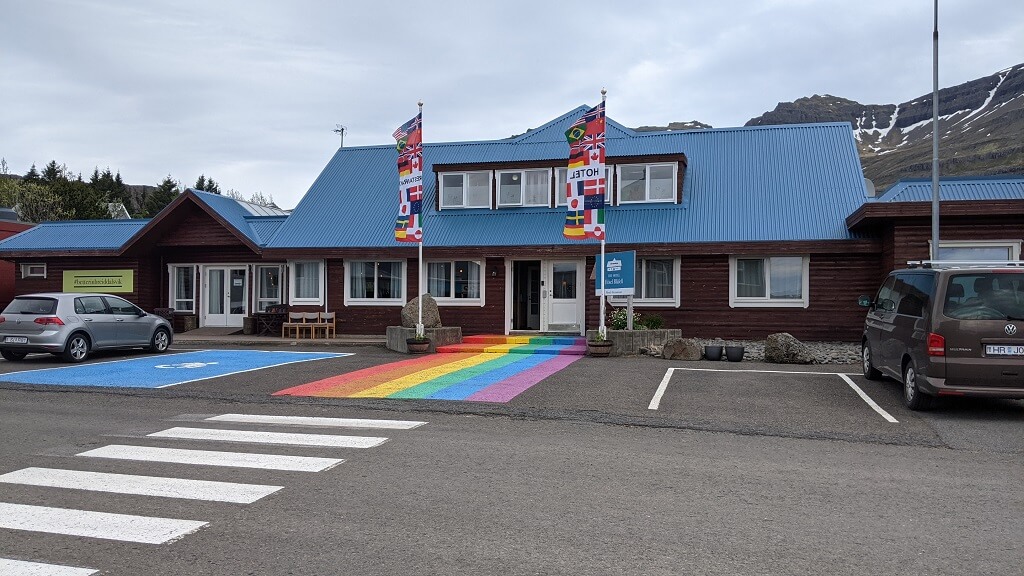 בדרך לעיירה הבאה מצאנו עוד בית גג-דשא פוטוגני. ומייד לאחריו הגענו לעיירה קטנטנה בשם Breiddalsvik. במהלך הטיול שלנו, שמנו לב שבאיסלנד נותנים ביטוי לחודש הגאווה בצבעים ודגלים והיה נחמד לראות שגם בעיירה כה קטנה מצאנו ביטוי לכך. ליד המזח מצאנו גן משחקים ובו סירה שניתן להכנס אליה (ככה מרגילים את הילדים להיות יורדי -ים מגיל צעיר) וטרמפולינה צבעונית שכמוה ראינו בהרבה מאוד מקומות במהלך הטיול.