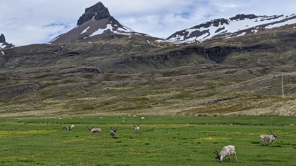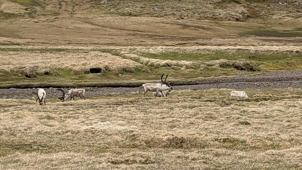 ביום הזה ציפתה לנו נסיעה ארוכה מהאזור המזרחי לאורך החוף הדרומי לכיוון אזור הקרחונים. אנחנו חילקנו את הנסיעה וקבענו לעצמנו לינה באזור Hofn לפני שנגיע ללגונות הקרחונים. רבע שעה אחרי שיצאנו דרך, פתאום לצד הכביש ראינו עדר של איילי הצפון (Reindeer) מסתובבים להם בנחת בשדה. זו חיה מרשימה מאוד רק היה לי קצת עצוב כשנזכרתי שהיא גם מופיעה בתפריט האוכל של האיסלנדים. אבל זה טבעו של העולם, עבורנו זו חיה אקזוטית בשבילם זו מנת חלבון.