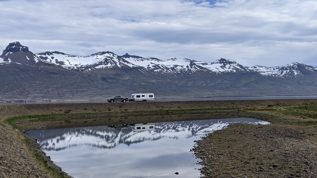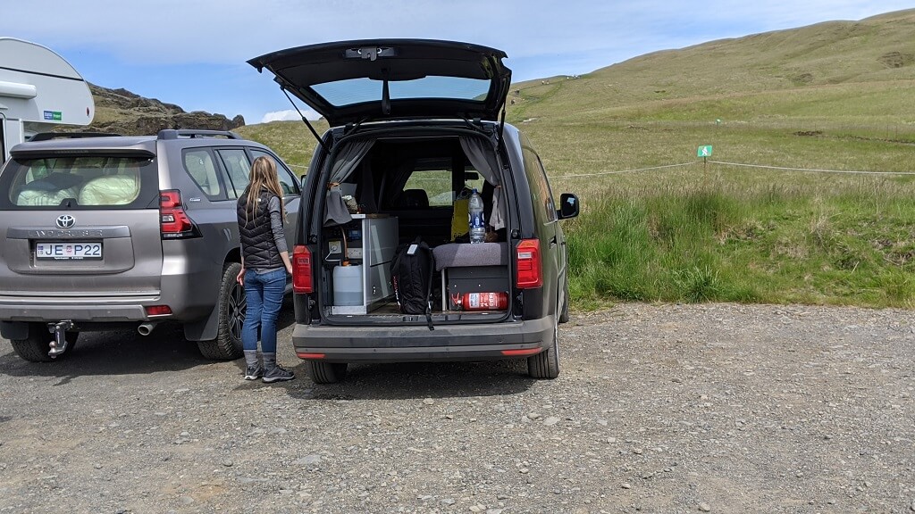 מלמעלה ראינו שצמוד לפארק יש חניון קרוואנים עצום בגודלו ומלא מאוד מאוד. מאחר ובעבר עשינו שני טיולים ארוכים עם קרוואן (בארצות הברית) כשהגענו למטה החלטנו לעשות סיבוב בחניון הזה ולראות איזה סוגים של קרוואנים יש באיסלנד. היה סיור נחמד. ראינו עשרות משפחות מקומיות עם שלל ילדיהם ושלל קרוואנים. תוך כדי הסיור הזה, הבנו שהסיבה לעומס הגדול בפארק, היא שילוב של מזג אוויר חמים ומעולה וסופ"ש.