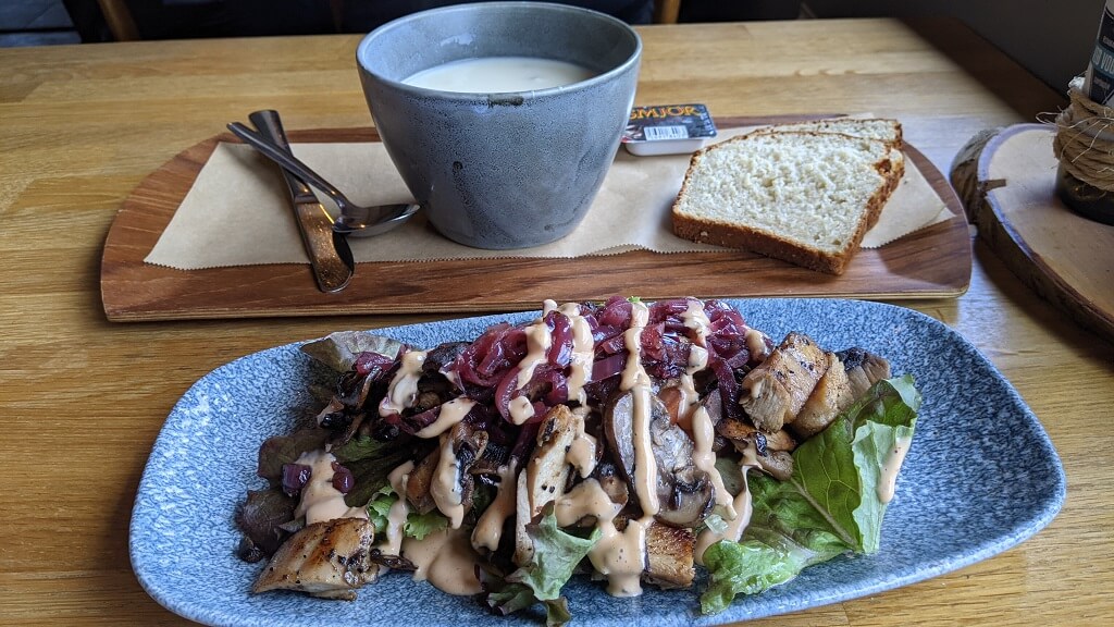 במסעדת Við Voginn עושים את הזמנת האוכל בקופה והם מביאים או קוראים לך כשהאוכל מוכן. הזמנו מרק אספרגוס וכריך עוף ואחר כך גם קפה הפוך ועוגייה לקינוח – היה מוצלח. גם אוירה קלילה ונחמדה שמתאימה לכל גיל וגם היה טעים.