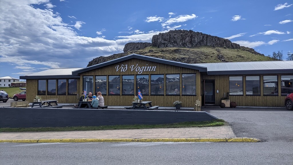 המסעדה נמצאת ממש ליד הים ומולה נמצא מרכז מבקרים מקומי. אחרי שאכלנו החלטנו לטייל קצת בקרבת המסעדה. הלכנו קצת מסביב ללשון הים ובמדשאה היפה באזור. אחר כך נכנסנו למרכז המבקרים וראינו שהוא מציג מוצרים איסלנדיים לתיירים. מיצינו די מהר וחזרנו לאוטו.