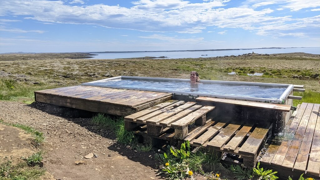 בקרבת העיירה היה לנו סימון במפה שמצביע על בריכת מים חמים חינמית. החלטנו לחפש את המקום. נסענו לאט וניסינו להבין את ההסברים. בשלב מסוים ראינו רכב חונה בצד הכביש והבנו שזה המקום. חנינו לידו, לקחנו מגבת, כפכפים והתחלנו לחפש את הבריכה. ואכן 2 דקות מהכביש מאחורי גבעונת קטנה – מצאנו אותה! זוג אמריקאי צעיר השתכשך במים והבחור אמר לנו שהמים רותחים ושכדאי לנו להכנס. עד שסיימנו להתפשט, הזוג הצעיר יצא והשאיר לנו את הבריכה רק לעצמנו – היה חם, מפנק ופשוט מדהים!