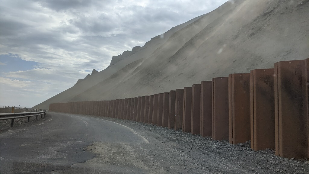 בשלב מסוים של הנסיעה עברנו בעמק שכבר בכניסה אליו יש שילוט שמזהיר מעוצמת הרוח ומסופות חול שמאפיינות את האזור. ואכן ההרגשה היתה שאנחנו נוסעים בתוך סופת חצץ. הרעש של החול המכה באוטו הזכיר רעש של ברד. למרות האזורים הקשים האלו, מדי פעם הדרך היתה רגועה וניתן היה לעצור ולצלם את היופי האינסופי של הארץ הזו