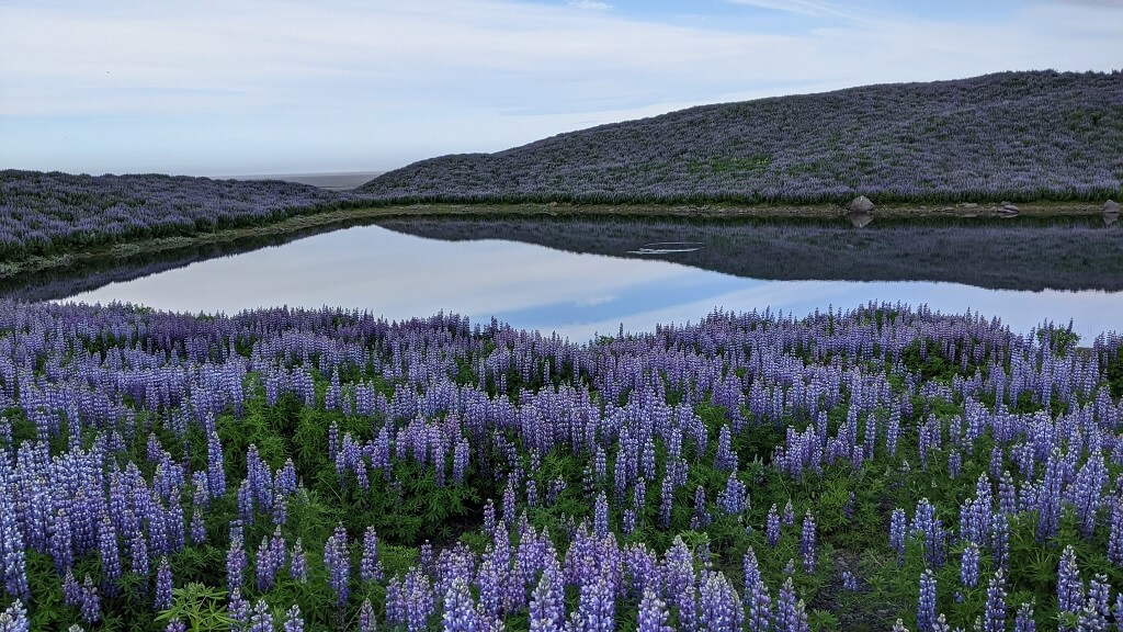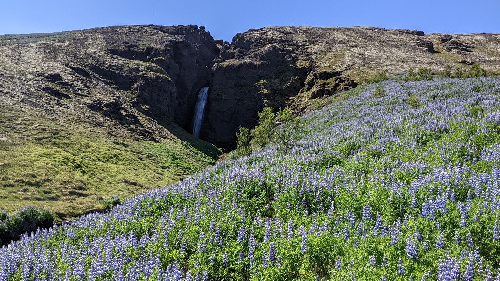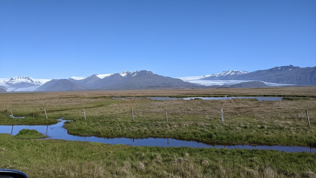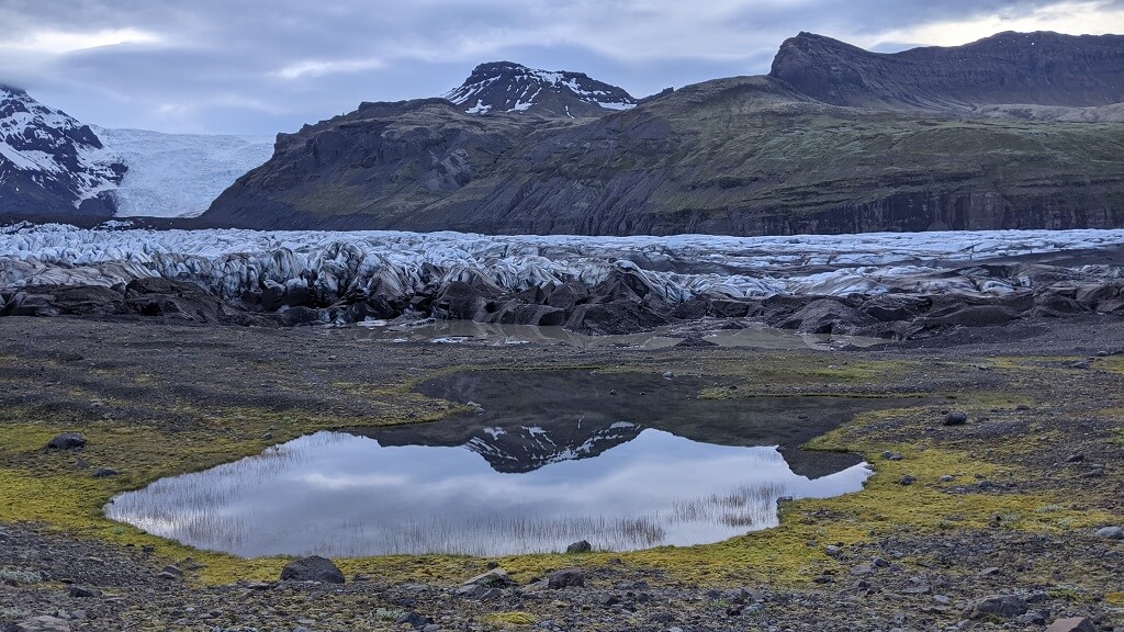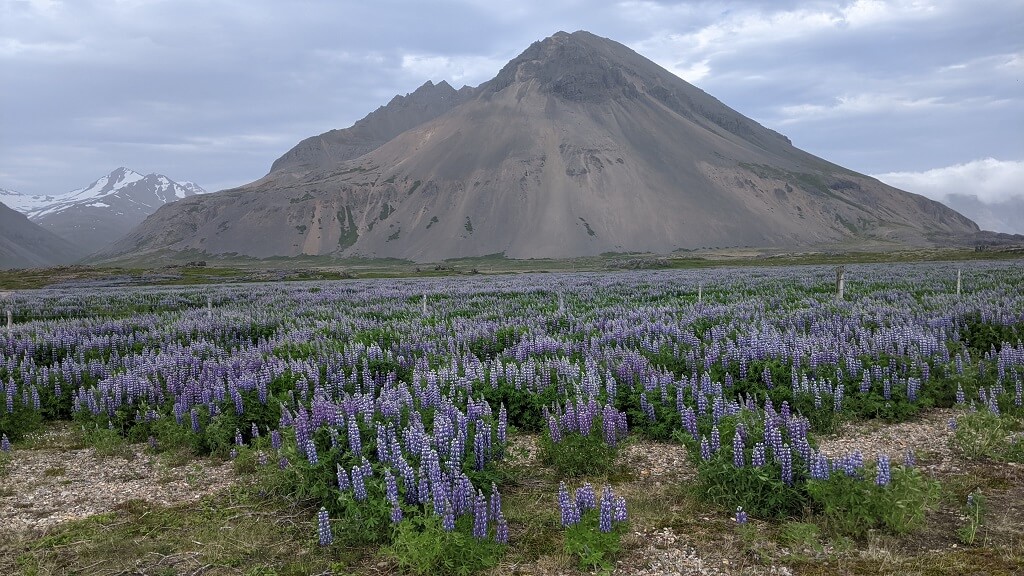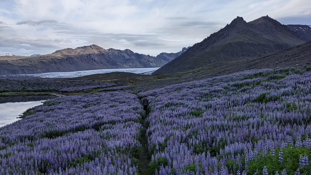 אחרי העומס התיירותי שחווינו ביום הקודם, החלטנו להתחיל את היום שלנו מוקדם מהרגיל. בשעה 7 וחצי עוד לפני ארוחת הבוקר, יצאנו למסלול שיוצא מהחצר האחורית של המלון ומגיע עד הקרחון הפרטי שלהם Svínafellsjökull Glacier. הדרך קלילה ונוחה ועוברת בתוך שדות של תורמוסים.