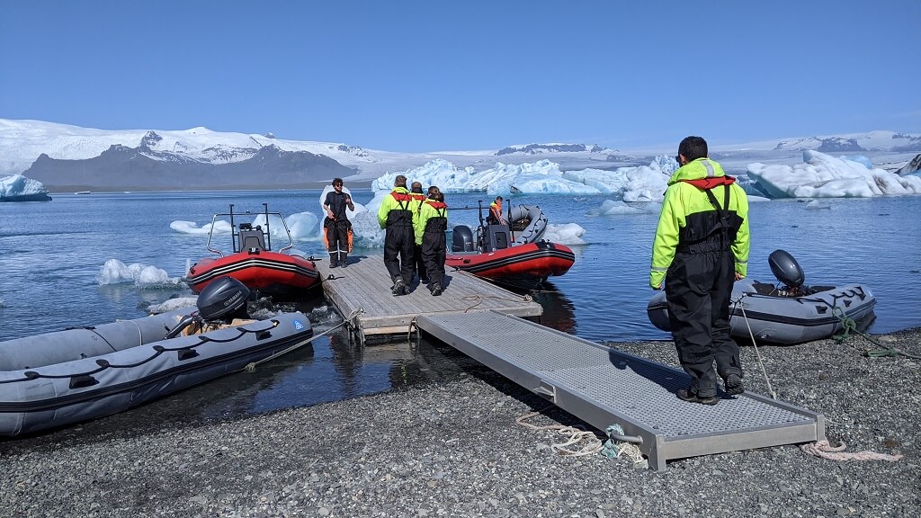 אכלנו מוקדם ויצאנו לדרך כך שבשעה 9 ועשרה כבר היינו בקופות של לגונת Jökulsárlón. מראש ידענו מה לא נעשה: הליכה על קרחון כבר עשינו בקנדה. בפעמים קודמות שניסיתי לשוט בקייאקים הצלחתי רק להסתובב במקום בחוסר אונים וחוצמזה בתנאי הרוח של איסלנד זה נשמע לי קשה וקר מדי. נשאר לבחור בין 2 האטרקציות הפופולריות ביותר שיט בזודייאק או באמפיבי. בקופה אמרו לנו שיש מקום בשתיהן, בחרנו בזודיאק שאיתו מגיעים קרוב יותר לקרחון, העלות 10000 קרונות לאדם לשעה של שייט.