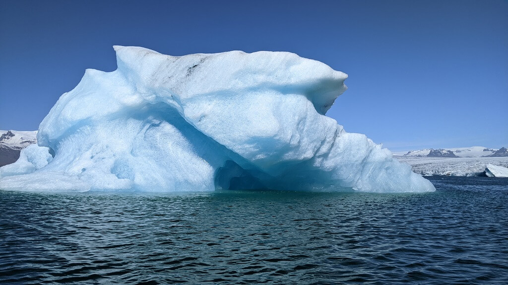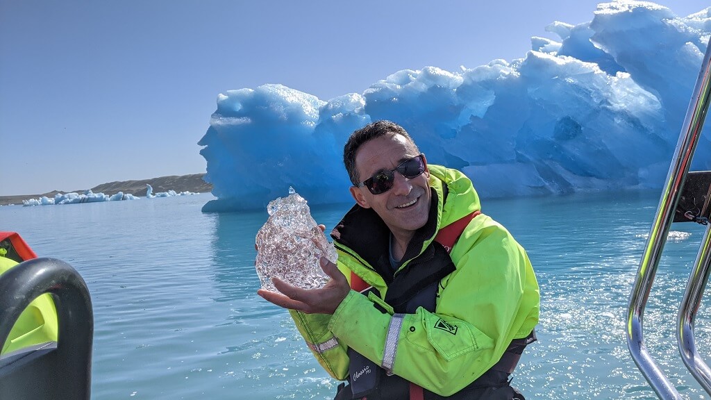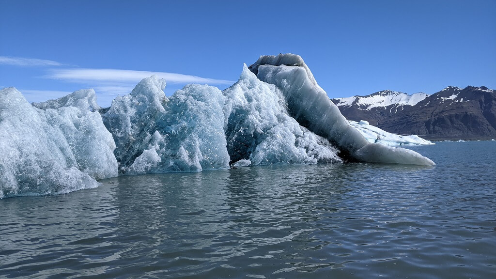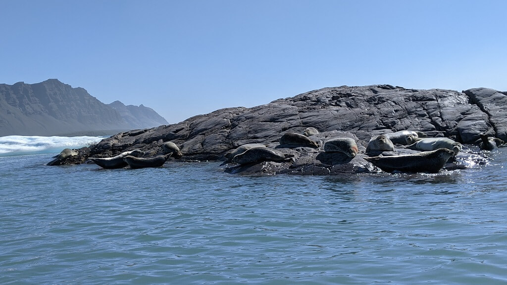 המדריך שלנו היה מאוד נמרץ, ברגע שסיימנו לעלות הוא אמר: "תחזיקו חזק" ותוך שנייה טסנו קדימה במהירות רבה. בין ניסיון להישאר יציבה וניסיון לא להפיל את הטלפון למים, הבחנתי שהזודיאק השני שט לו באיטיות רחוק מאחורה. כשהגענו לאזור עם הרבה קרחונים צפים, המדריך האט ועברנו לשייט נינוח יותר. הוא סיפר לנו שזה יום השמש הראשון של העונה אבל שלפי התחזית צפויה להתחיל בקרוב רוח מאוד חזקה ולכן הם יבטלו את הסיורים הבאים.