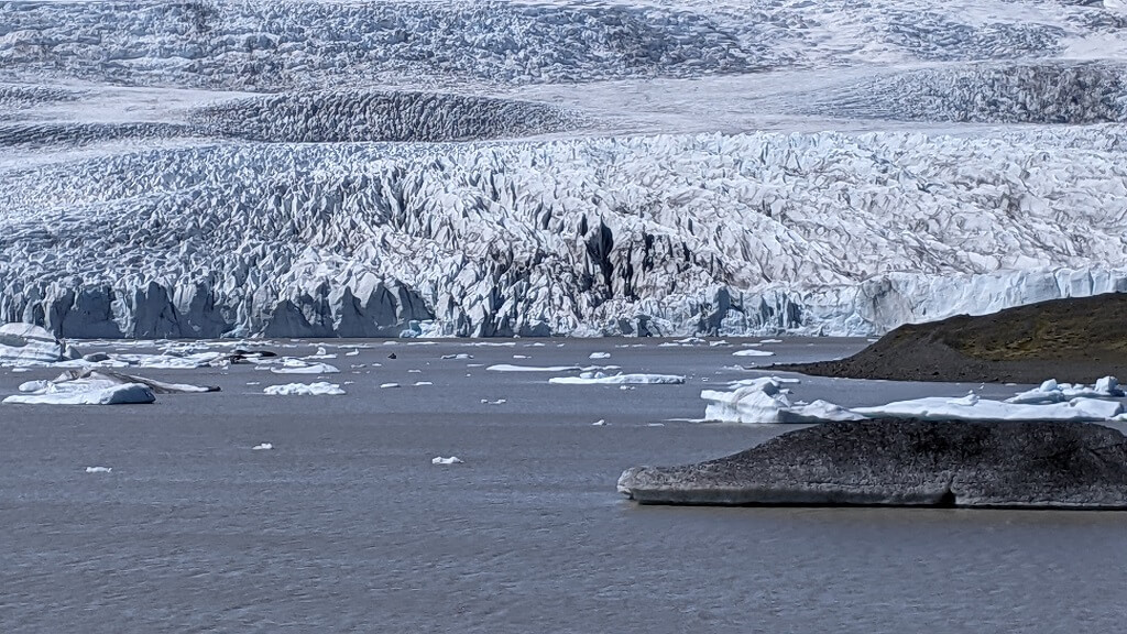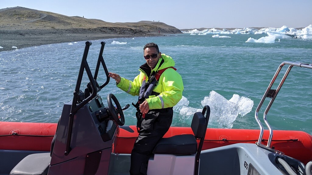 המדריך החביב שלנו חלק איתנו כל מיני סיפורים ועובדות על הלגונה. בצער רב שמענו שהלגונה הולכת וגדלה כי הקרחון הולך ומתכווץ ובעתיד הלא כל כך רחוק, ישאר שם רק פיורד. תוך כדי סיפורים התקרבנו במידת האפשר אל הקרחון עצמו. יש הגבלה על המרחק אחרי שסירות התהפכו בגלל נפילות של גושי קרח למים.