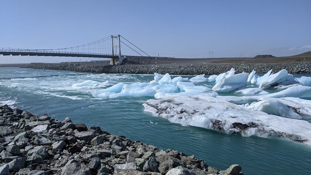 אחרי השייט שהיה חביב מאוד, אבל מבחינתנו היה יכול גם להיות קצר יותר (נמשך כשעה) חזרנו לחניון שבשלב הזה כבר היה עמוס למדי. שתינו כוס קפה (דלוח) ואז הלכנו לאורך הנהר לכיוון חוף היהלומים. בדרך ראינו קרחון נשבר וחלקים ממנו החלו נסחפים עם הזרם החזק של הנהר, לכיוון הים – זה היה מדהים. המשכנו לעקוב אחרי השברים עד שהגענו לחוף עצמו.