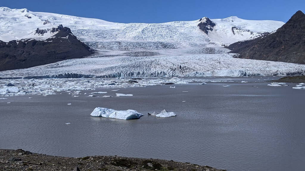 נסענו ללגונת הקרחונים השנייה, שהיא קצת יותר קטנה וקצת פחות מתויירת Fjallsárlón Iceberg. בגלל המיקום שלה המרוחק מהים ובגלל שאין חיבור לים, מזג האוויר היה נינוח יותר. הרוח הייתה קלילה והיה אפילו חמים. התחלנו במסלול הליכה שמקיף את הלגונה ובסופו אמור להגיע ליוקולסלרון. מהר מאוד ראינו שהמסלול מרחיק אותנו מהלגונה עצמה והנוף נראה לנו שומם וחדגוני. החלטנו לוותר על המסלול הזה ולהסתפק בטיול קצר על גדת הלגונה.