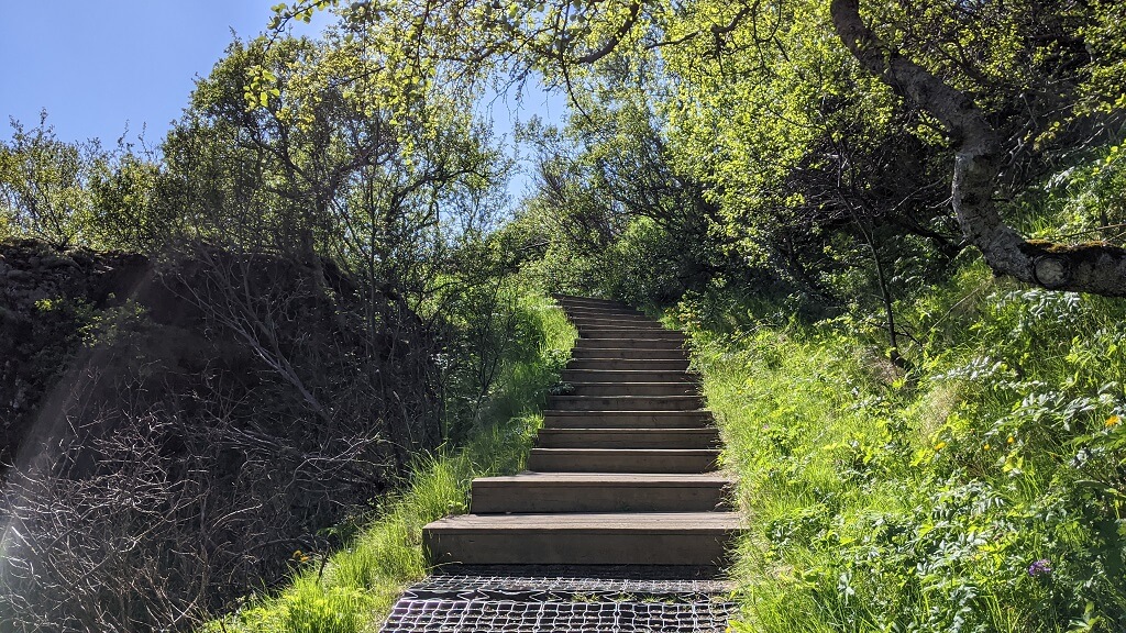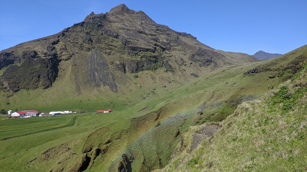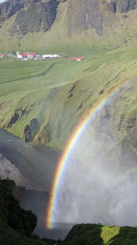 החניון של סקוגפוס היה די עמוס. זה מפל מאוד מפורסם וזה ניכר גם בכמות המבקרים. החלטנו שנעשה קודם חלק ממסלול המפלים ורק בסיום נתקרב למפל הגדול. המסלול מתחיל במדרגות די תלולות אל מעל המפל עד לנקודת תצפית, אומרים שזה 520 מדרגות – אבל לא ספרתי. התצפית גבוהה ויפה. שמועות מספרות שבמזג אוויר חורפי מסוכן לעלות אליה. אנחנו התברכנו ביום שמש אביבי והתצפית אל מעבר למפל הייתה מדהימה, דווקא את המפל עצמו רואים פחות טוב מהנקודה הזו.