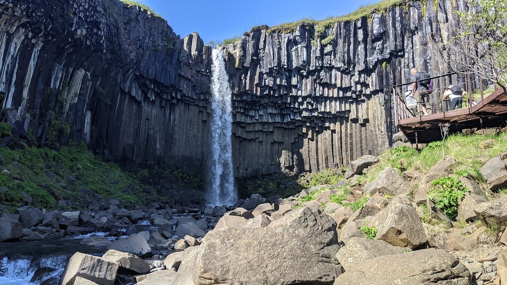 הגענו לשמורה בסביבות 16:00 אחה"צ. החניון היה עמוס במכוניות. למעשה היום הזה היה היום הראשון ואפשר להגיד גם האחרון, שבו חווינו עומס (יחסי) של תיירים, הרבה יותר ממה שראינו עד כה. לפי השילוט הבנו שצריך לשלם על החנייה אבל אתר התשלומים לא עבד ולכן נכנסנו למרכז המבקרים ושילמנו שם. אחרי ששילמנו לקחנו מפה של הפארק ויצאנו בדרך אל המפל השחור Svartifoss.