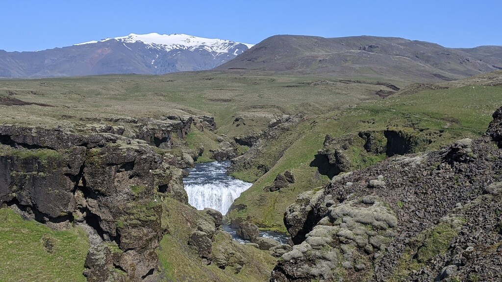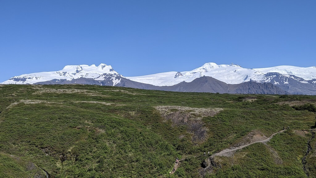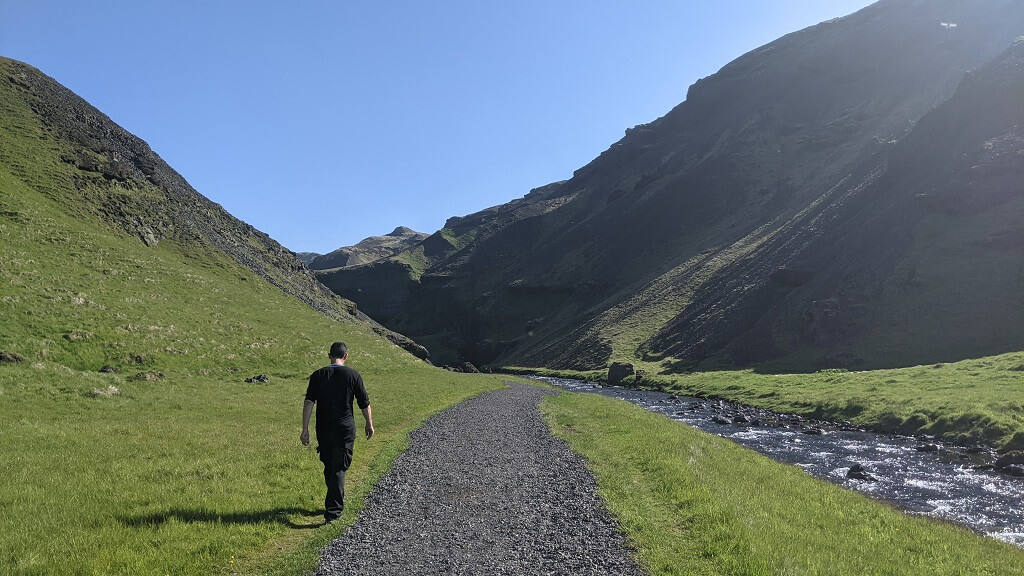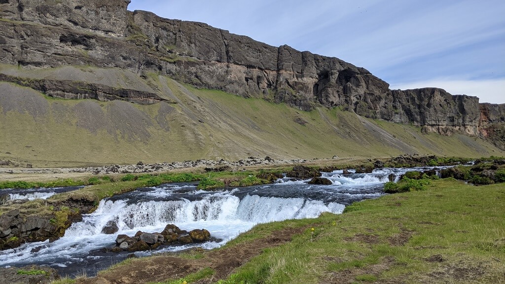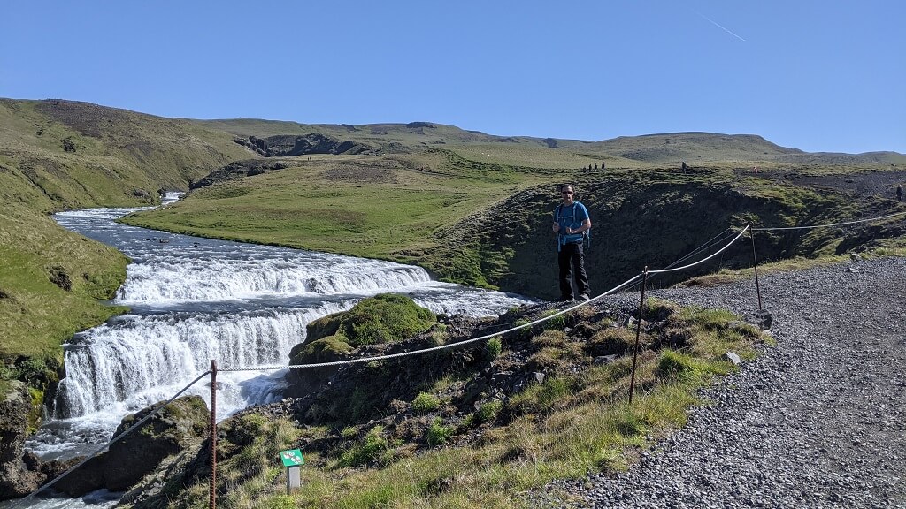 בנוסף, פגשנו זוג עם תינוק קטן על הגב. כל כמה דקות הם עצרו ובדקו שהרוח לא מקפיאה אותו (זה היה בתחילת המסלול כשעוד היה קריר). וראינו שתי בנות שסחבו תיקים ענקיים והיו בדרכן לת'ורסמוק (כ-24 ק"מ). חלפנו על פני הורים עם שלושה בנים ששלחו אותם לרוץ קדימה ולהוציא אנרגיה, ההורים עצמם נראו מותשים והיו עוד כמה שאני כבר לא זוכרת. התרשמנו שזה מסלול די פופולרי למרות שהוא היה הרבה פחות עמוס מפארק Skaftafell. מבחינת עניין, הנהר והמפלים מאוד יפים, שאר הנוף די חדגוני.