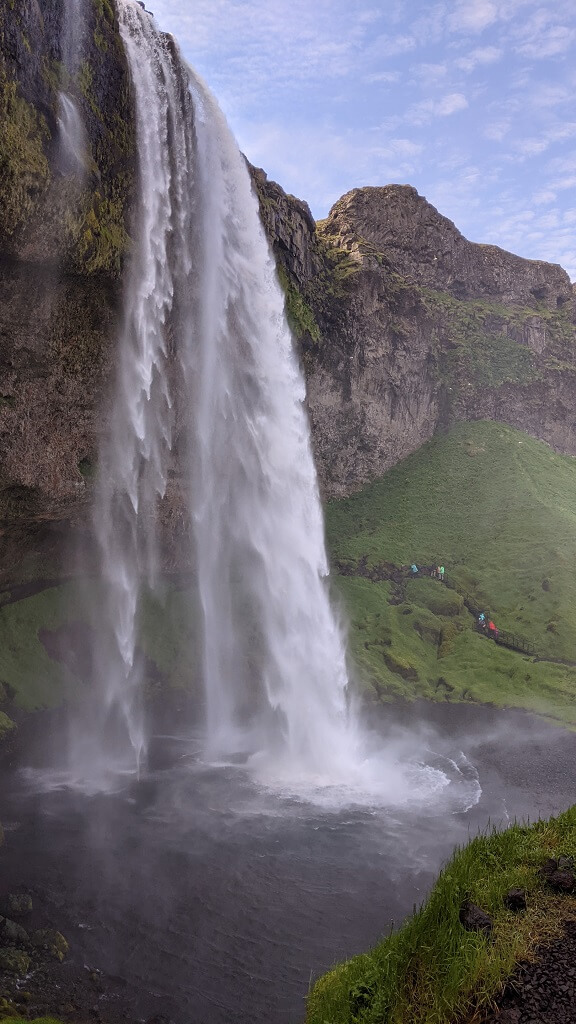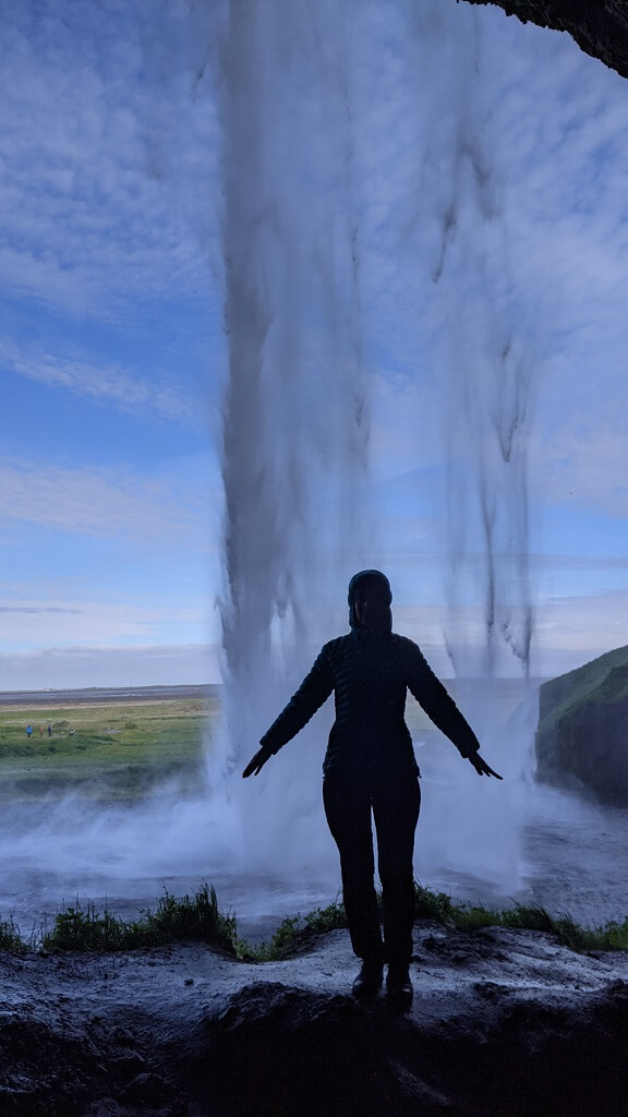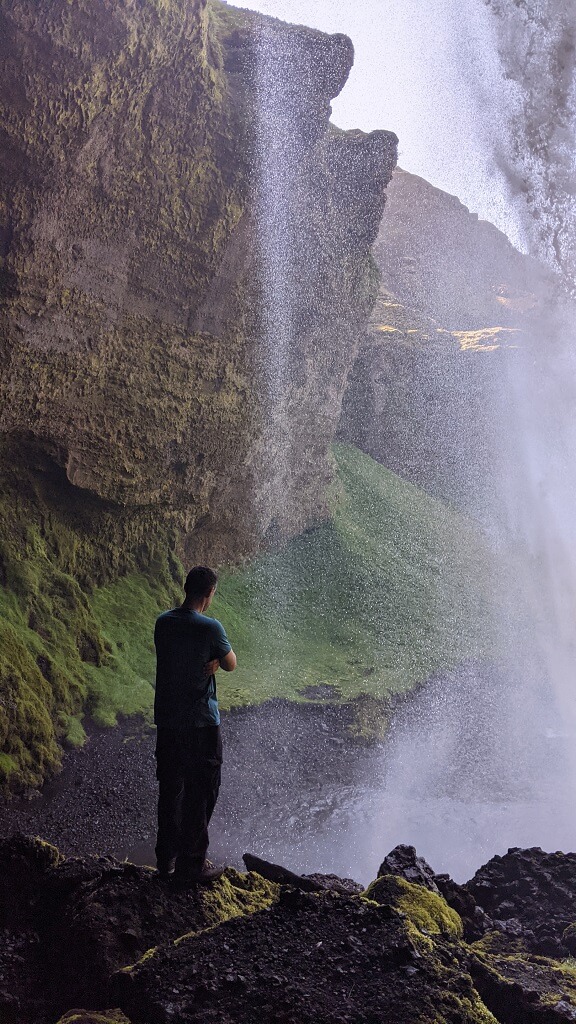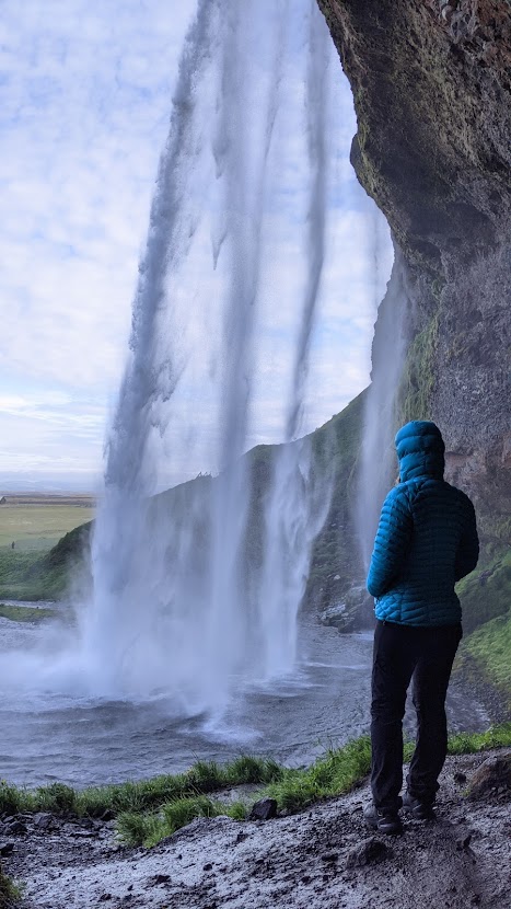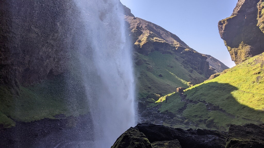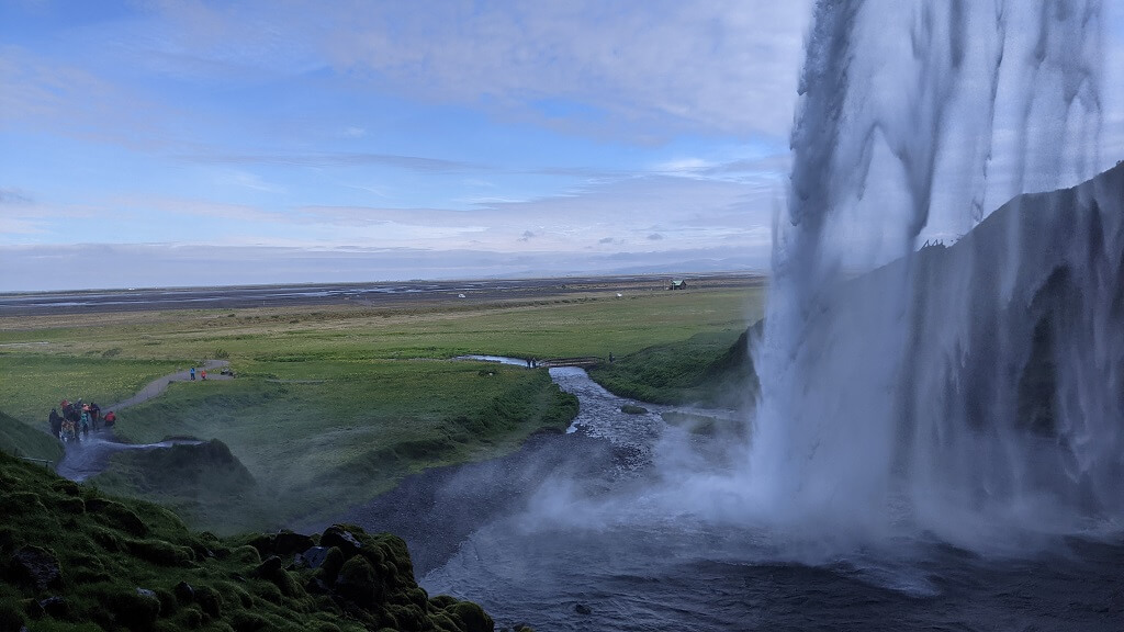 חלפנו על פני סקוגר והמפל הענקי שלה (Skógafoss) והמשכנו עד פינת חמד בדרך שבה עושים מסלול הליכה קצרצר בין שני מפלים. את הרכב החנינו ליד מפל Seljalandsfoss. החניה בתשלום (באשראי) של 700 קרונות. את המפל רואים כבר מהכביש המוביל לאזור ויש לידו חניון בתשלום. הייחוד שלו הוא בכך שיש מסלול הליכה מאחוריו. "רגע! גם אתמול היינו במפל שזה הייחוד שלו, לא?". אכן כן היינו ב – Kvernufoss. מסתבר שיש שני מפלים כאלו והם אפילו די קרובים אחד לשני. זה בהחלט מבלבל ומסתבר שבשלב התיכנונים חשבתי שזה אותו מקום.