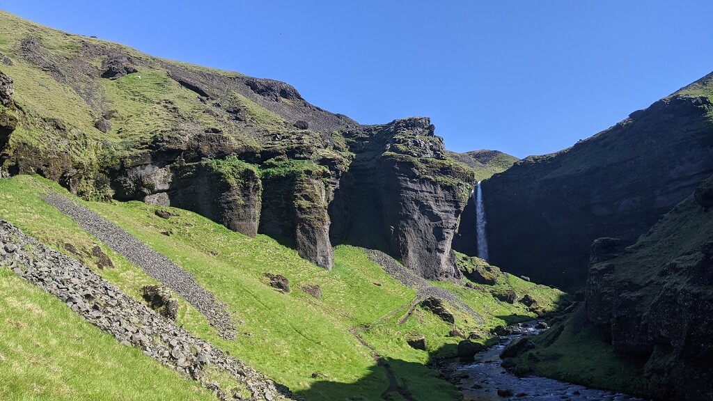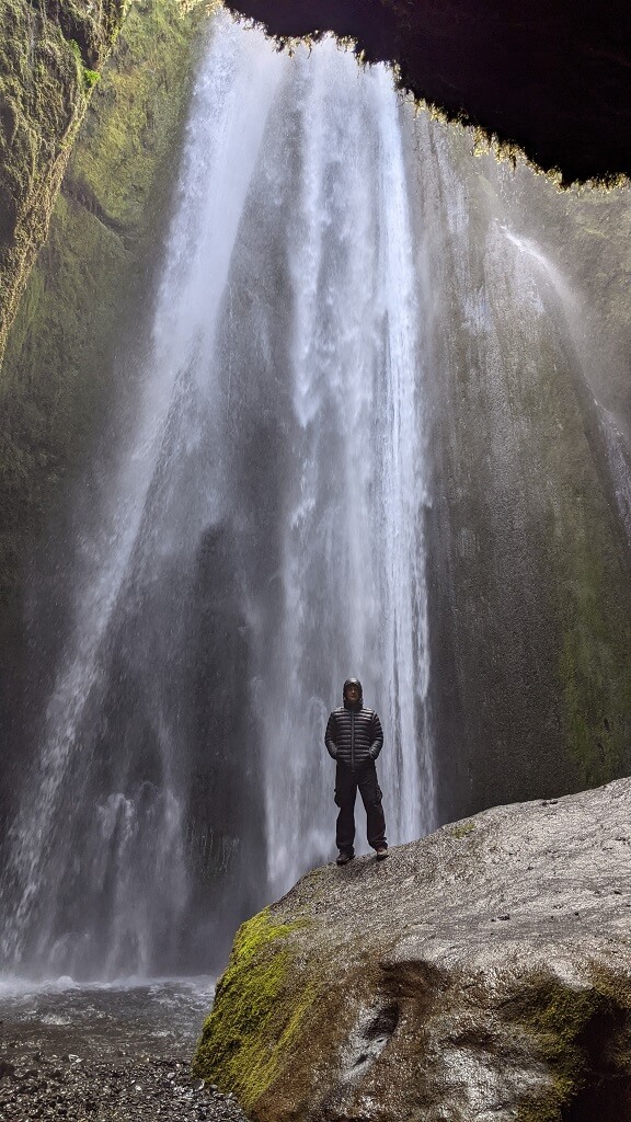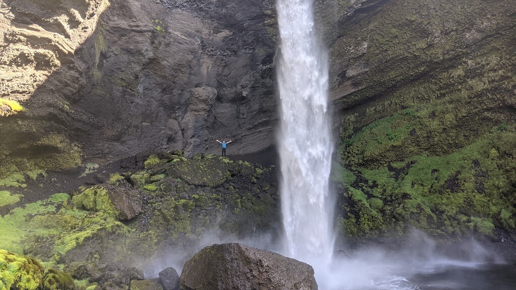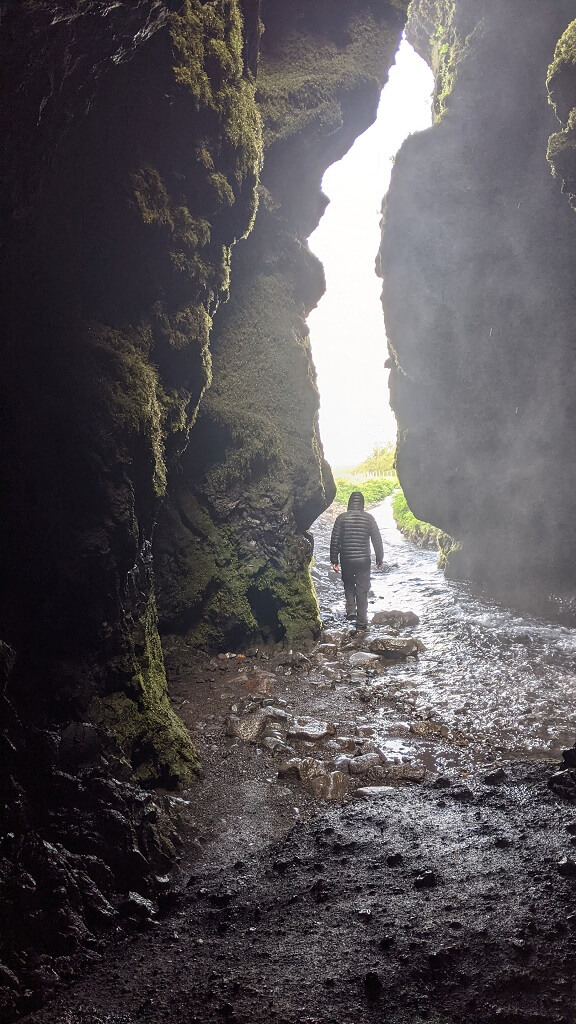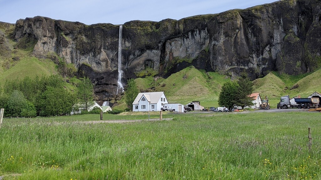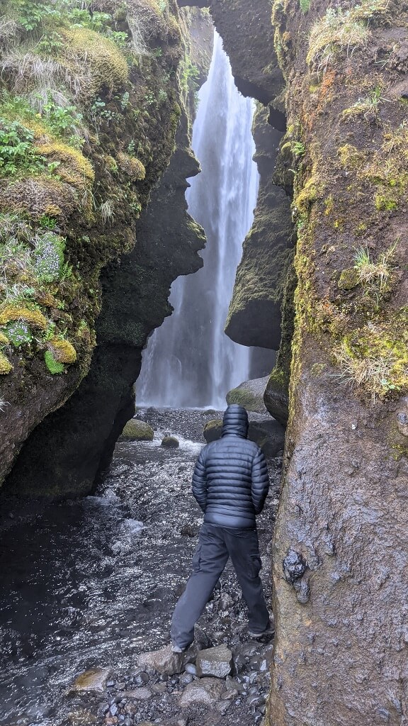 חלפנו על פני סקוגר והמפל הענקי שלה (Skógafoss) והמשכנו עד פינת חמד בדרך שבה עושים מסלול הליכה קצרצר בין שני מפלים. את הרכב החנינו ליד מפל Seljalandsfoss. החניה בתשלום (באשראי) של 700 קרונות. את המפל רואים כבר מהכביש המוביל לאזור ויש לידו חניון בתשלום. הייחוד שלו הוא בכך שיש מסלול הליכה מאחוריו. "רגע! גם אתמול היינו במפל שזה הייחוד שלו, לא?". אכן כן היינו ב – Kvernufoss. מסתבר שיש שני מפלים כאלו והם אפילו די קרובים אחד לשני. זה בהחלט מבלבל ומסתבר שבשלב התיכנונים חשבתי שזה אותו מקום.