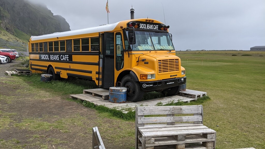 את השהות שלנו בויק החלטנו להתחיל בבית הקפה המומלץ Skool Beans Cafe. מדובר באוטובוס בית ספר שהוסב לבית קפה מקומי. יש מעט מאוד מקומות ישיבה בפנים ובכל הפעמים שעברנו לידו (הוא היה קרוב מאוד למלון שלנו) היה עמוס מאוד בחניה. תפסנו לנו מקום בפנים והזמנו קפה, שוקו ובייגל. השוקו (הבינוני) והקפה (הסביר, לא יותר) הגיעו די מהר אבל לבייגל חיכינו וחיכינו וחיכינו. שאלתי את המלצרית מה קורה עם הבייגל והיא אמרה שהם מאוד עמוסים. זה היה נכון, ראיתי לבד, בכל זאת כל המקום כולל המטבח נכנס בתוך אוטובוס. בסוף נמאס לי לחכות והלכתי לשלם בקופה. שם הסתבר לי שהמלצרית עשתה בלאגן שלם בהזמנות, אנשים קיבלו את הדברים הלא נכונים או כמוני, לא קיבלו בכלל. האחראית במקום התנצלה עמוקות והציעה שתכין לנו מחדש, אבל בשלב הזה העדפנו לוותר. נפרדנו כידידים והלכנו למלון שלנו ליומיים הבאים Hótel Vík.