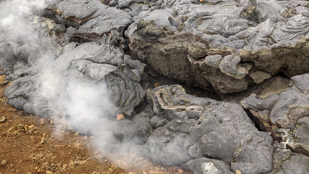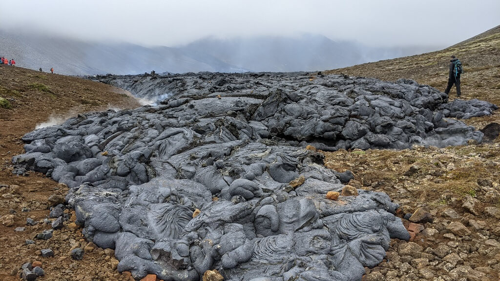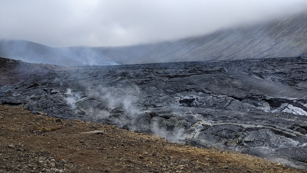 היום האחרון של הטיול. התכנית הייתה לחזור להר הגעש ולעלות לעוד תצפית עליו. אבל התעוררנו לבוקר שטוף ערפל, מלווה בגשם קל ורוח. במצלמות התצפית המכוונות 24/7 על לוע הר הגעש – לא ניתן היה לראות כלום חוץ מערפל. ובכל זאת לא אמרנו נואש. אחרי שעצרנו במאפיית Kökulist bakery ולקחנו כריכים לדרך. נסענו לחניון של דרך A. בדיוק כמו שעשינו לפני שבועיים. והלכנו עם מעילים וחליפות גשם אל עמק הלבה. הפעם הלבה הייתה די קשה. אפילו ראינו אנשים עומדים עליה. ניכר היה שאין זרימה חדשה ורק מתחת הכל עוד רוחש וגועש.