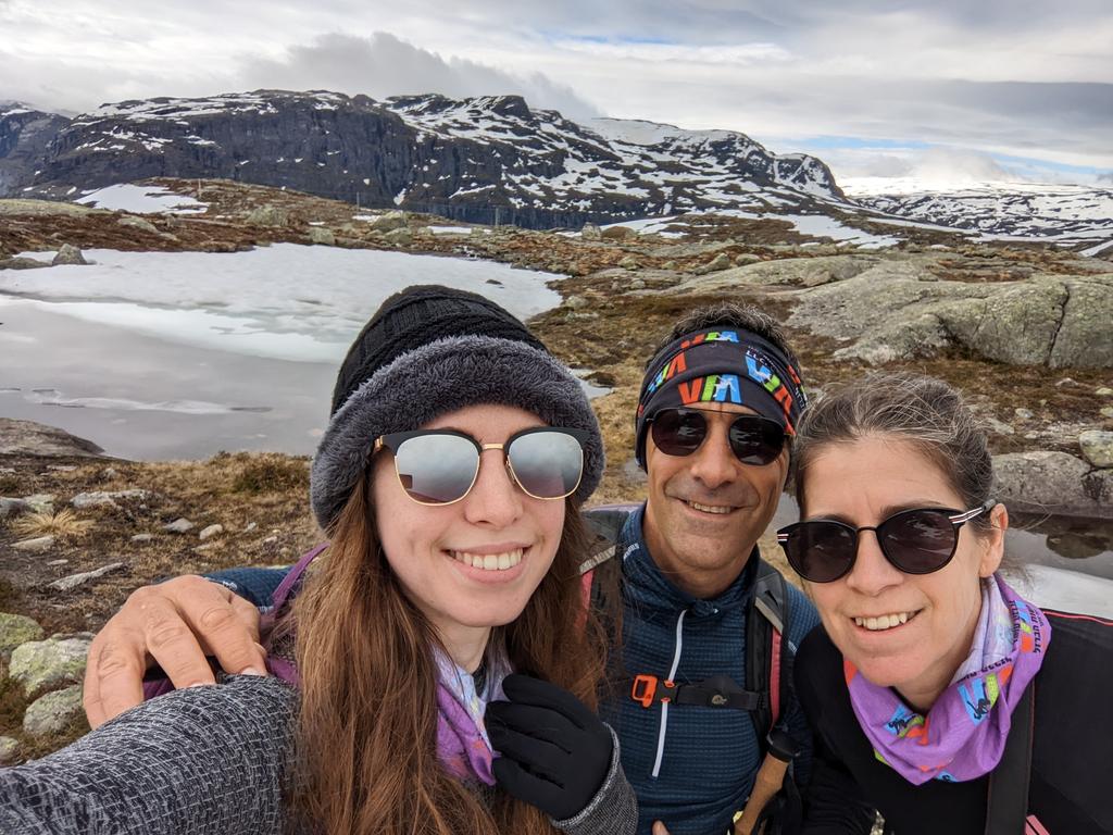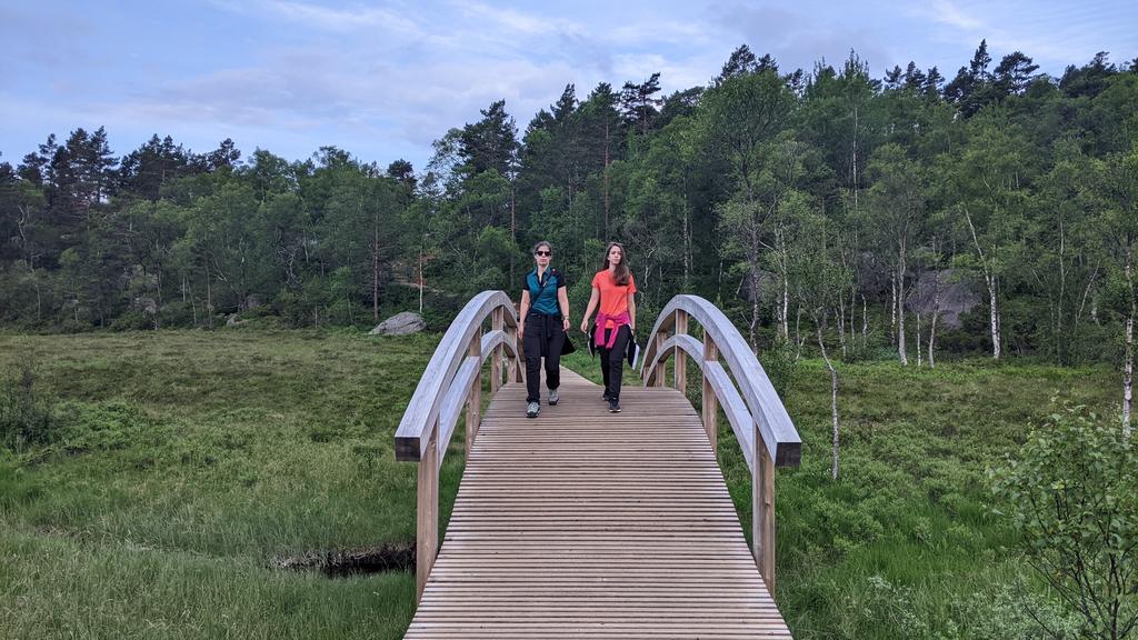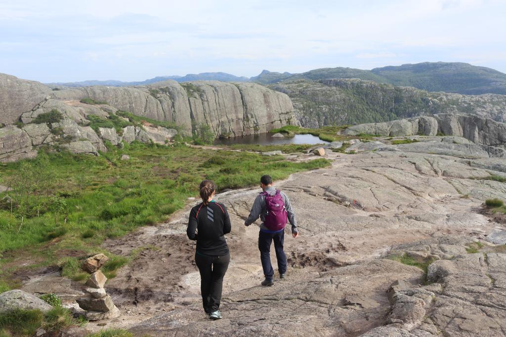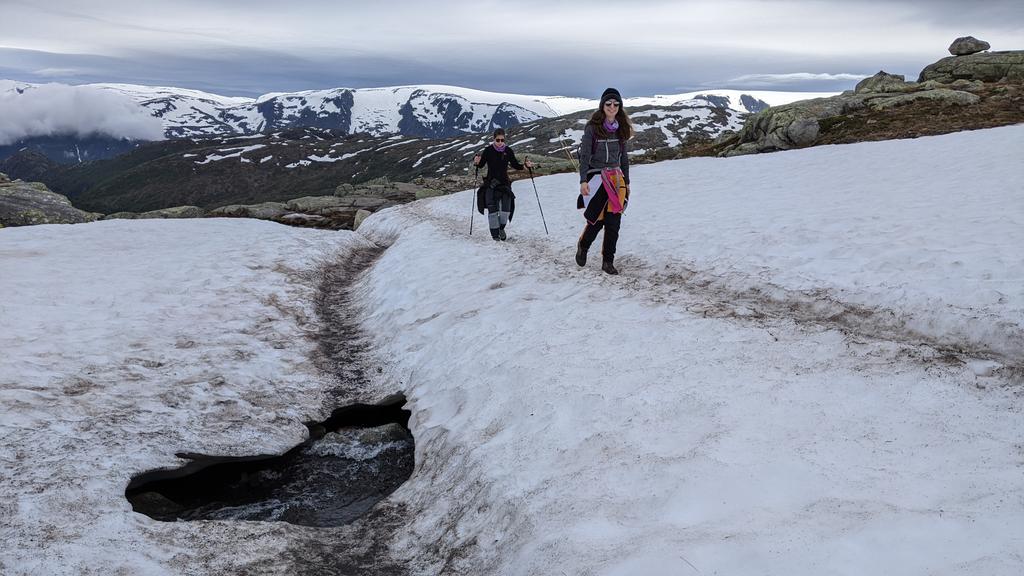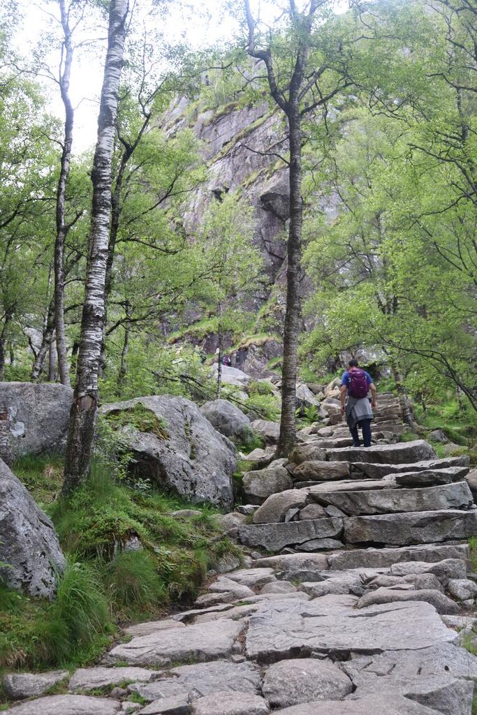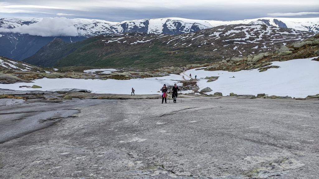 ממש בתחילת המסלול ראינו קבוצה של נערים ונערות בגיל תיכון, הם הלכו בנחת וקישקשו כאילו שהם מטיילים במרכז קניות ולא באחד המסלולים המפורסמים והמאתגרים של נורבגיה. הם היו לבושים עם בגדי בית ספר ולא נראו מצוידים לטרק ארוך ואכן בשלב מסוים הם הפסיקו ללכת. התאוריה שלנו היא שזה נערים מהתיכון המקומי ובגלל שאין מרכזי קניות או מקומות בילוי באזור, כשהם מבריזים מהלימודים הם יוצאים לבלות בחיק הטבע.