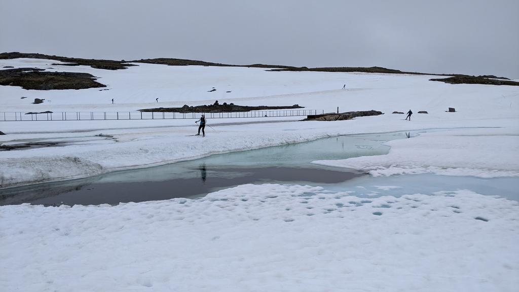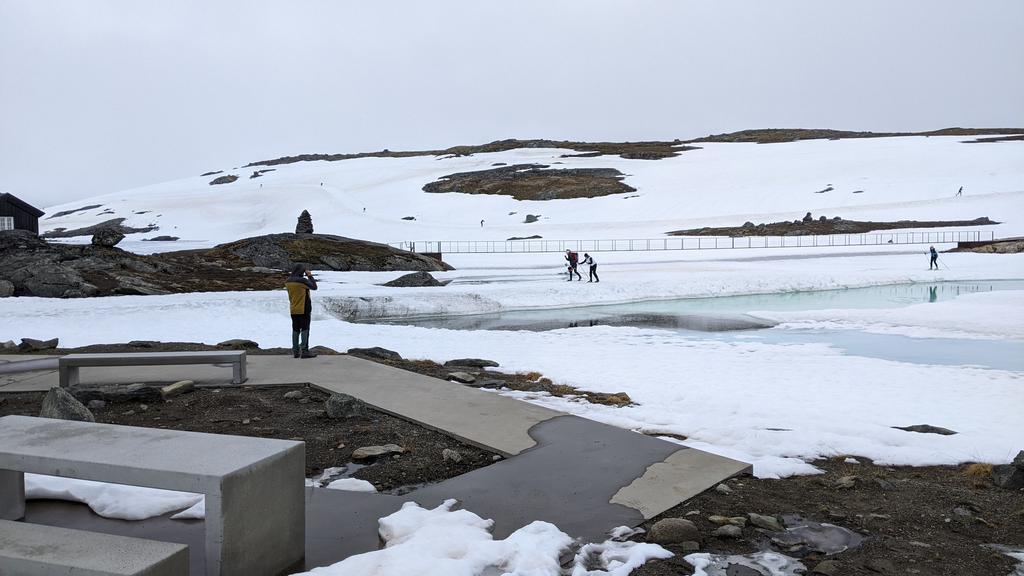 אחרי שיצאנו מלום הנוף הפך מושלג יותר יותר. בהתחלה רק שלוגיות קטנות ובהדרגה עוד ועוד שלג עד שהגענו ממש לאתר סקי. הטמפרטורה בחוץ הייתה 5 מעלות בלבד. באתר הסקי היו לא מעט אנשים, אומנם סקי ממש כבר לא ניתן לעשות אבל הם עסקו ב"צעידת שלג" מעין החלקה על השלג במישור. זה ספורט נחמד אבל נראה לי שנדרש כושר ממש טוב כדי לשרוד יותר מכמה דקות כי אמנם ההתקדמות היא על מגלשי סקי אך ללא מדרונות הסקי התלולים צריך להיעזר בכוח פיזי כדי להתקדם.