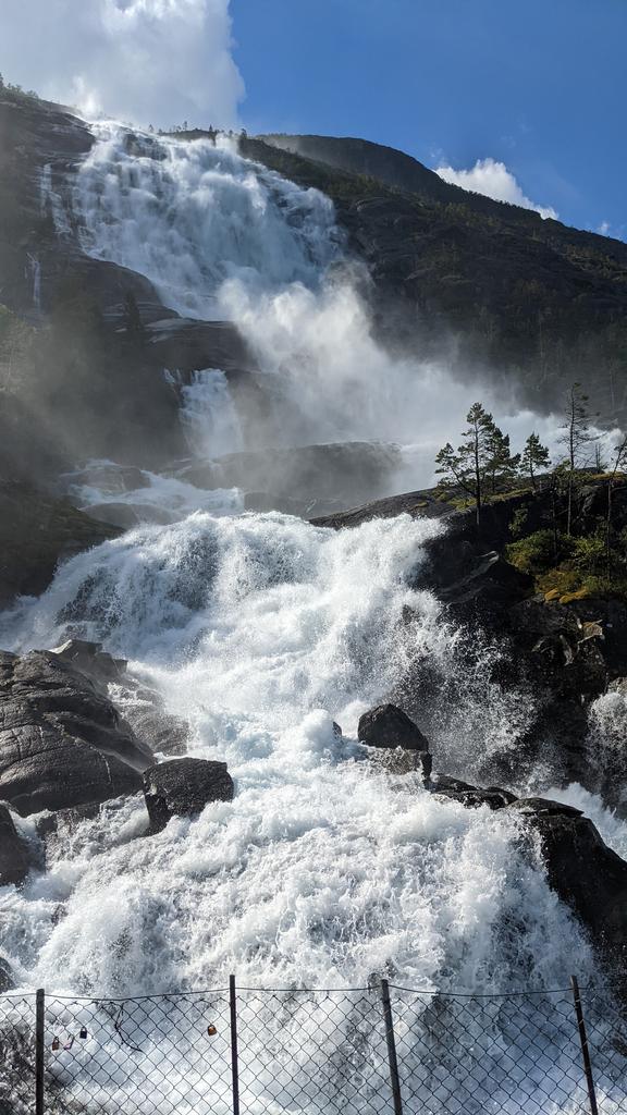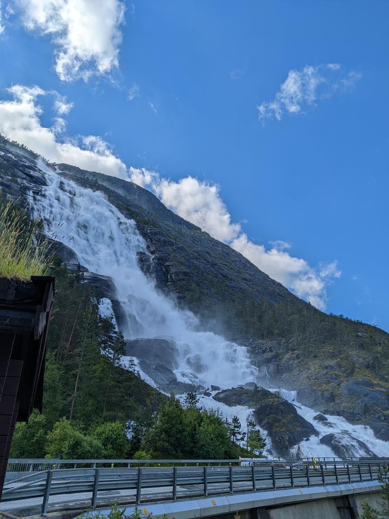 בדרך עצרנו במפל מדהים ביופיו Langfoss. משהו בזווית של נפילת המים והעוצמה המטורפת של הזרימה יוצר מראה של עננים שנשפכים מהמפל או שזה נראה קצת כמו רעמות של סוסים לבנים – זה ממש מפל מהפנט ביופיו