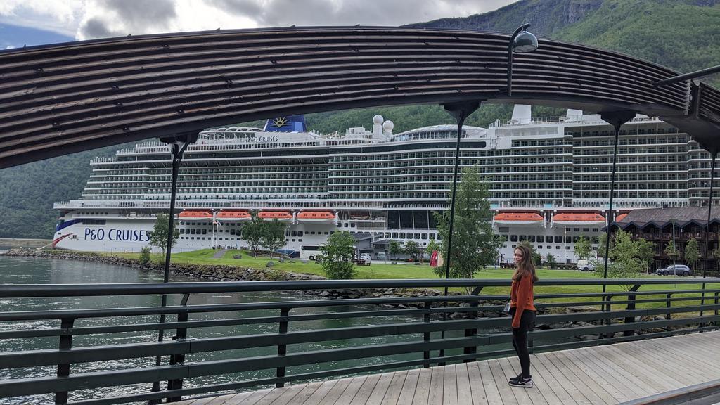 התעוררנו בנחת . אל מול הפיורד ובצער רב ארזנו את עצמנו ועזבנו את הכפר הקטן. חזרנו לפלאם לאזור תחנת הרכבת והמעגן. הופתענו למצוא במזח אניית קרוזים ענקית שלא הייתה שם אתמול בשום שלב. כנראה שהיא הגיעה בלילה.
