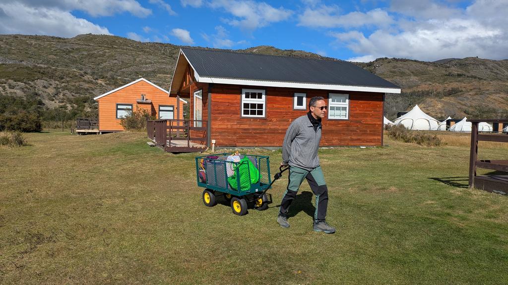 תוך עשר דקות, סיימנו בירוקרטיה רגילה, העמסנו את המזוודות והאוכל על עגלה ויצאנו דרך הדשא לבקתה שלנו.