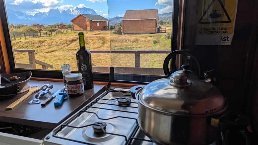 אחרי שנרגענו מהתקף הצחוק, ארגנתי לנו ארוחת ערב וישבנו לאכול מול הנוף המדהים. ליווינו את הארוחה ביין בינוני מאוד, אבל זה בסדר כי גם הווייפיי היה חלשלוש והמקלחת הייתה מאתגרת וכאמור הכל ידענו מראש פשוט העדפנו לישון שם בגלל הקרבה לפארק והנוף.
