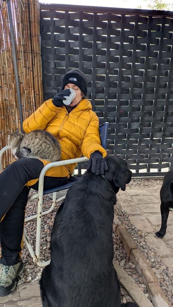 אצל הוגו ישבנו קצת בחצר הקרה יחד עם כל באי הבית, כלומר אשתו ועוד כמה חתולים וכלבים שממש אהבו אותנו. בזמן שחיכינו שהמונית שלנו תגיע, "זכינו" לטעום יין שהוגו מכין לבד, אנחנו ממליצים שהוא ימשיך עם האופניים וישאיר את תחום היין לאחרים. חימנה הראתה לנו על המפה עוד כמה יקבים שהיו סגורים היום אבל יפתחו ביום שני כך שאם נרצה נוכל לבקר בהם. היא גם סיפרה לנו שבקיץ יש להם 40 מעלות על בסיס די קבוע. אז למרות שהיו רגעים ממש קפואים במהלך הרכיבה, כנראה עדיף לבוא כמונו בסתיו כשיש רוח וגשם.