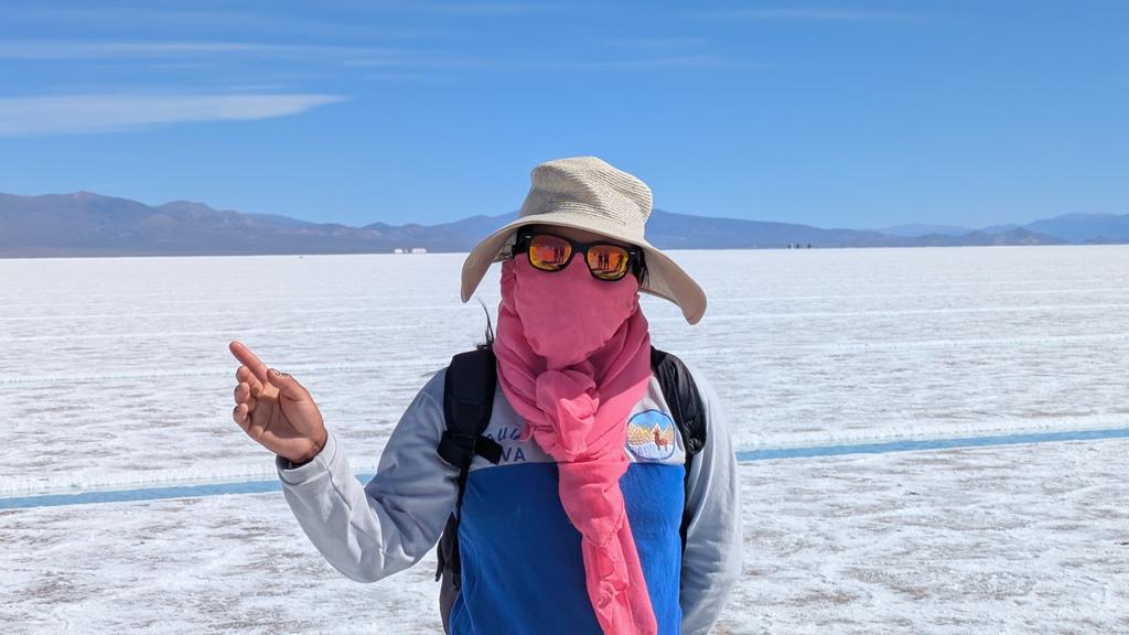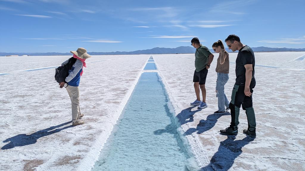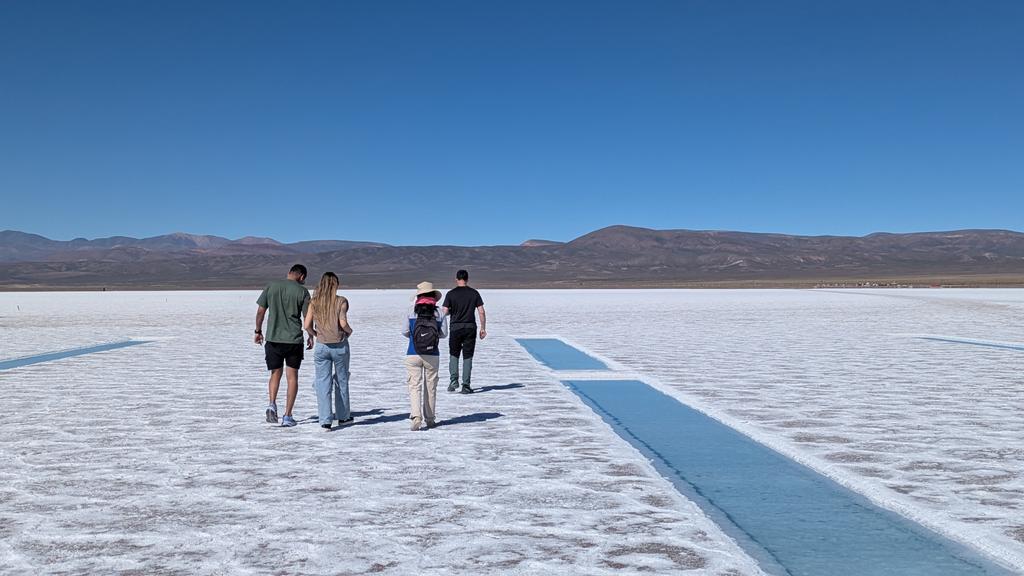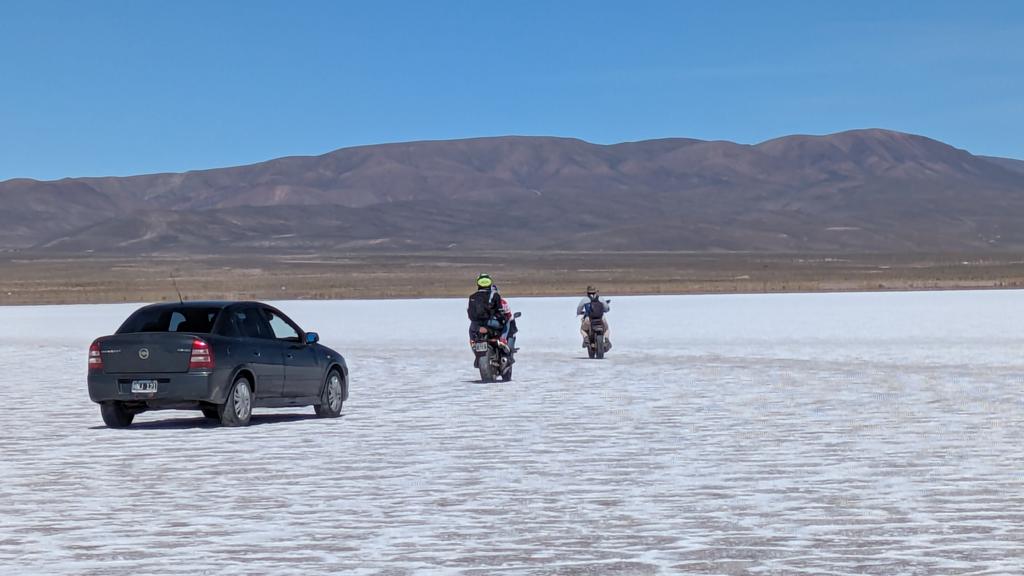 כשהגענו לאתר, בחור מקומי הכווין אותנו אל החנייה ואל הקופות, שילמנו כעשרה דולר במזומן וציוותו אותנו לרכב נוסף עם זוג צעירים מבואנוס איירס. חיכינו כמה דקות בחנייה עד שהגיעה מדריכה מקומית ואמרה שהיא לוקחת לסיור את שני הרכבים. לחלק מהמדריכים יש אופנוע שטח או רכב אבל המדריכה שלנו באה ברגל, הצטרפה לרכב של הזוג מבואנוס איירס (תודה לאל שהיא לא הצטרפה אלינו) ונסענו אחריהם אל תוך ימת המלח.