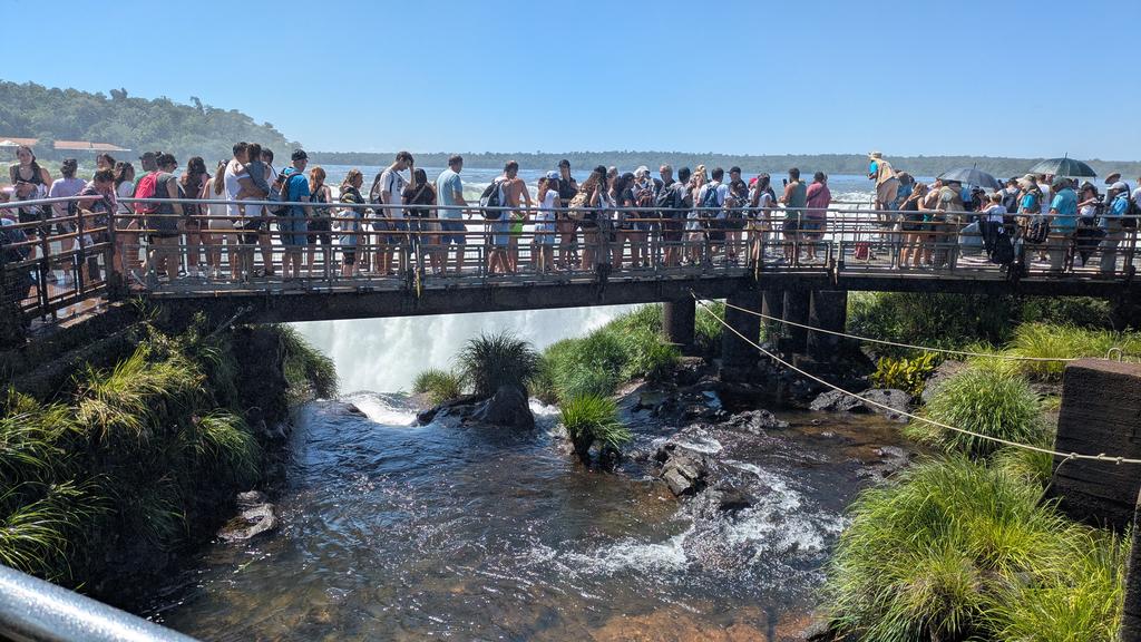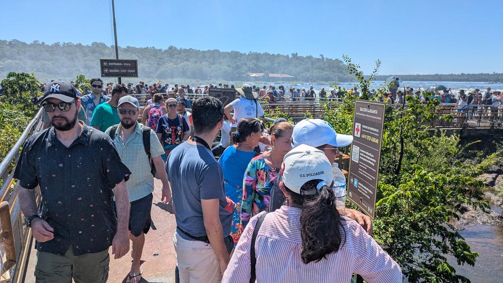 כשסיימנו עם השייט, הלכנו למרכז הפארק ונסענו ברכבת הפנימית של הפארק לתחנה שמובילה אל המפל הגדול. כמות האנשים בשביל עץ שמוביל למפל וגם במרפסת תצפית – הייתה זוועה. פשוט מחריד, מסתבר שלהגיע ביום ראשון זה פחות מומלץ מבחינת רמת הדוחק. נדחקנו ונדחפנו עם כולם עד שהגענו לבמה המרכזית, הסתכלנו כמיטב יכולתנו אך מבלי לסכן את עצמנו בדריסה על ידי קהל אנשים ודי מהר פשוט נסוגנו חזרה לשביל.